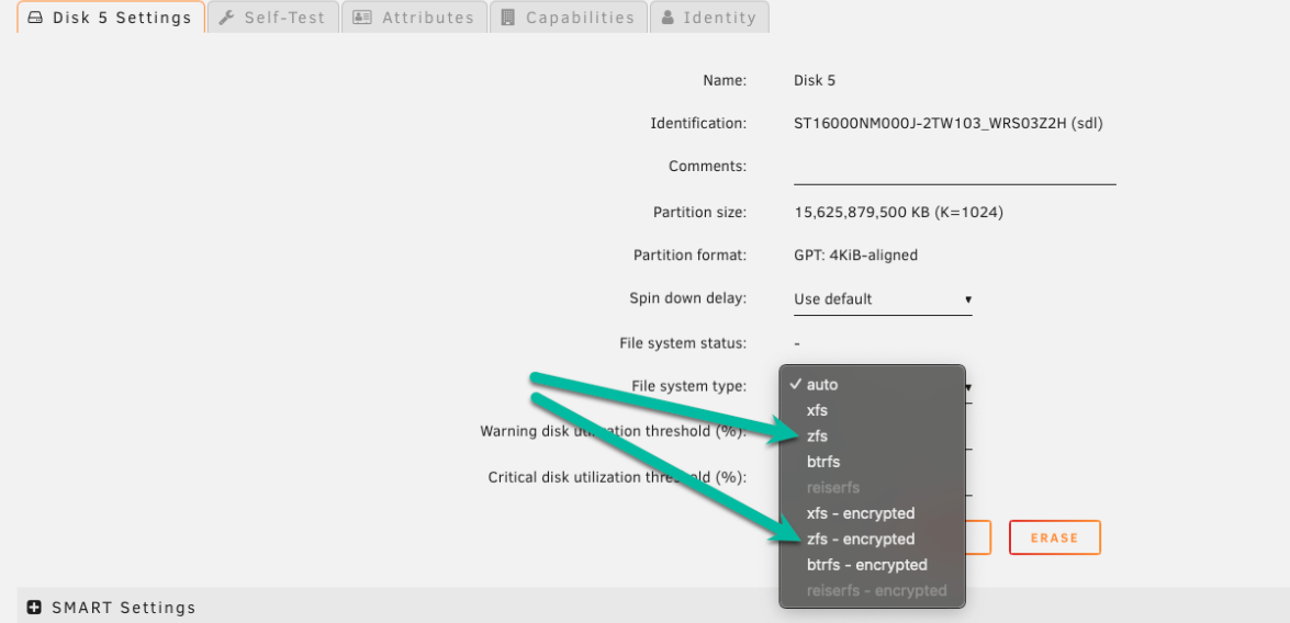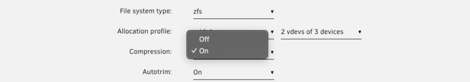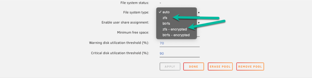 2. Définissez le type de système de fichiers sur zfs ou zfs-encrypted (pour le cryptage LUKS).
