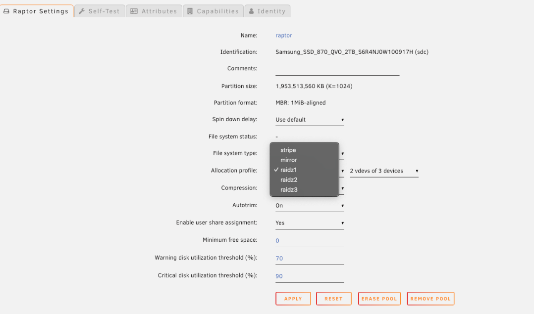 4. Définissez le système de fichiers sur "Auto" : Cliquez sur le nom du pool (par exemple, raptor) et définissez Système de fichiers sur Auto.